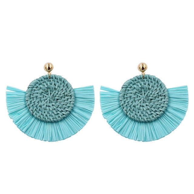 Light Blue Wicker Woven Round Coin and Fringe Earrings