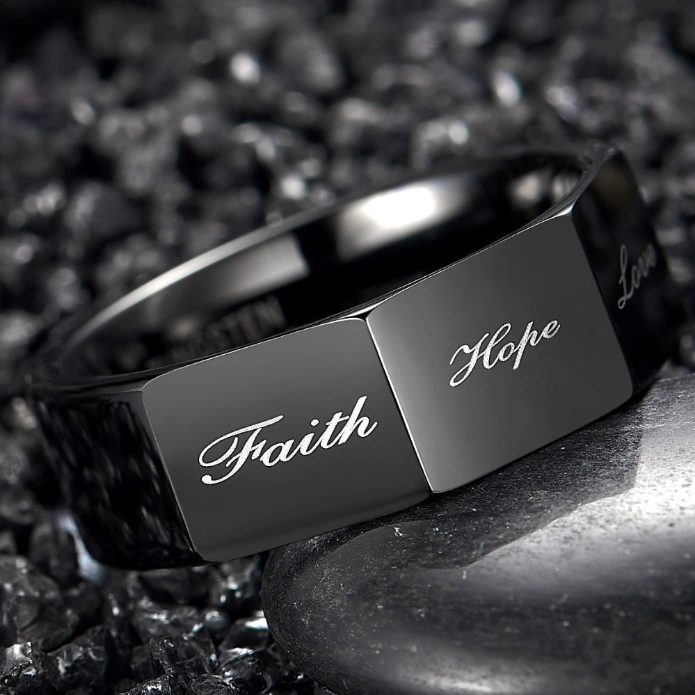 Men's 8mm Three-Sided 'Faith | Hope | Love' Tungsten Carbide Ring Description: Mark the beginning...