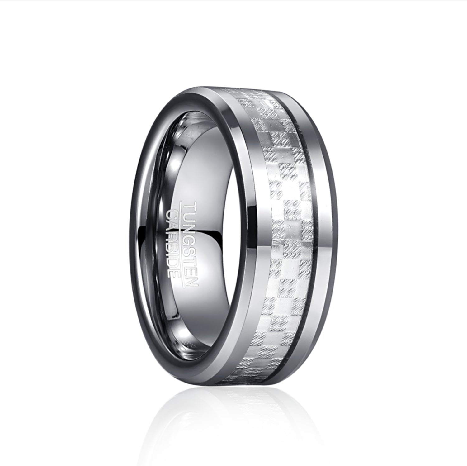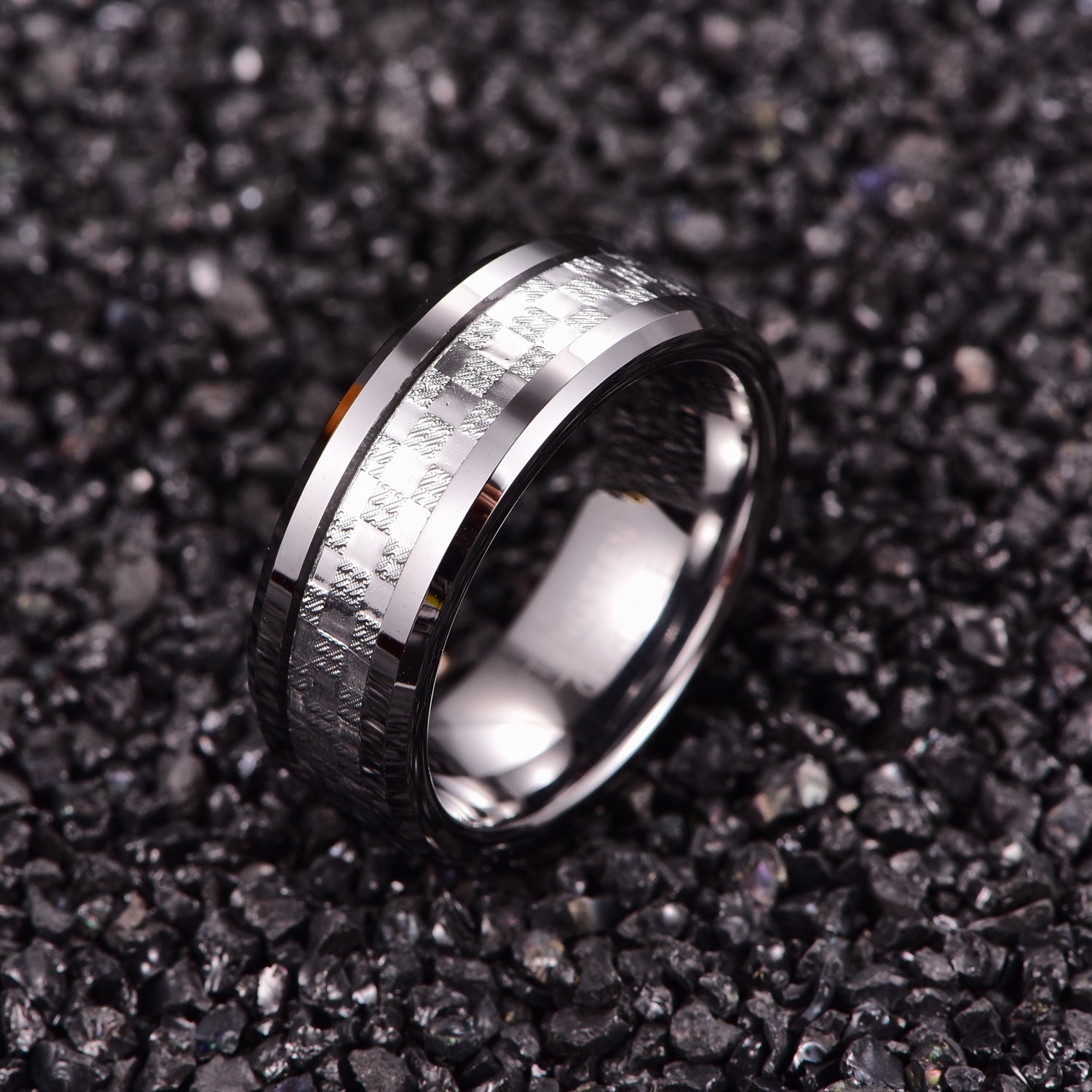Men's 8mm Silver Checker Inlaid Tungsten Carbide Ring