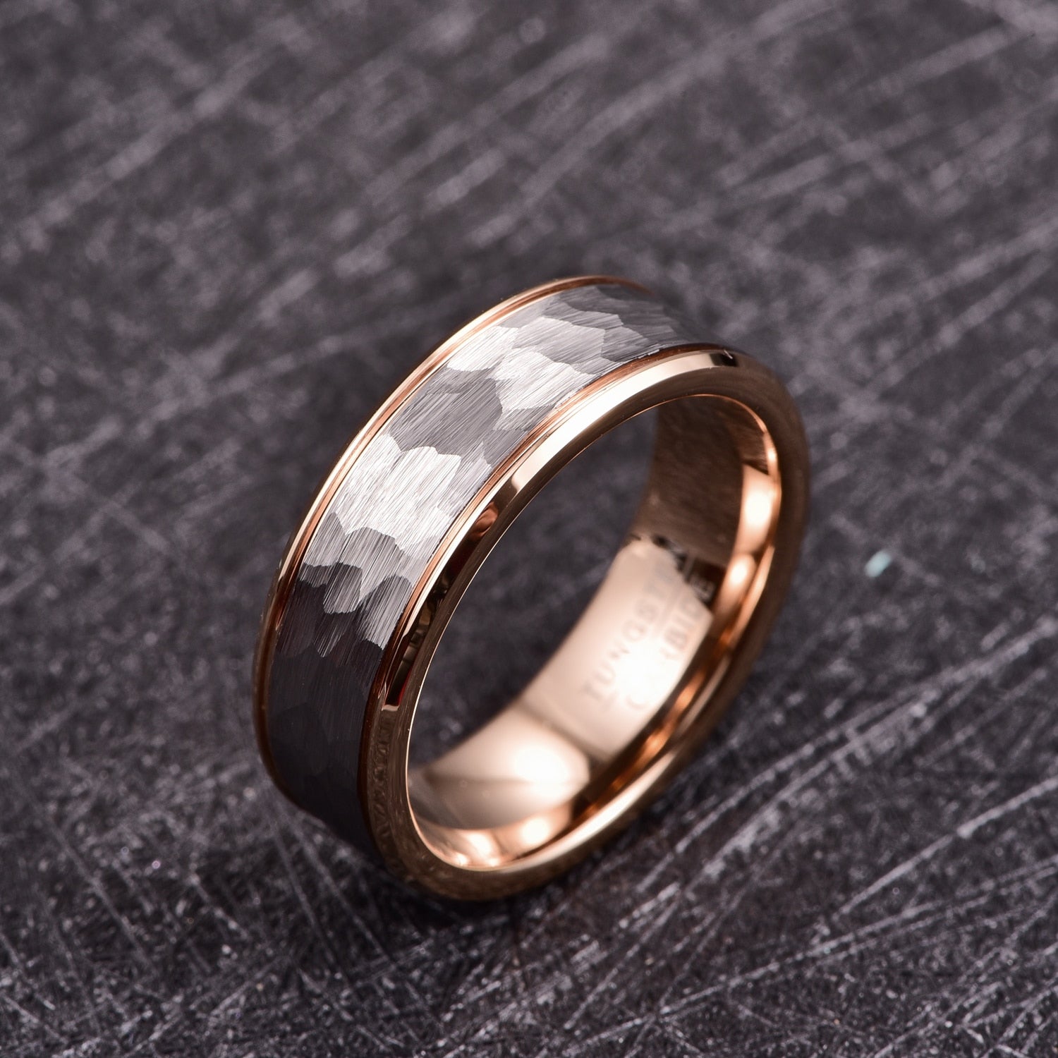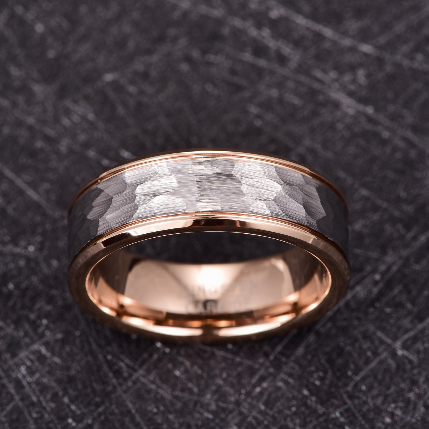 Men's 8mm Silver Hammered Rose Gold Inner Tungsten Carbide Ring Description: