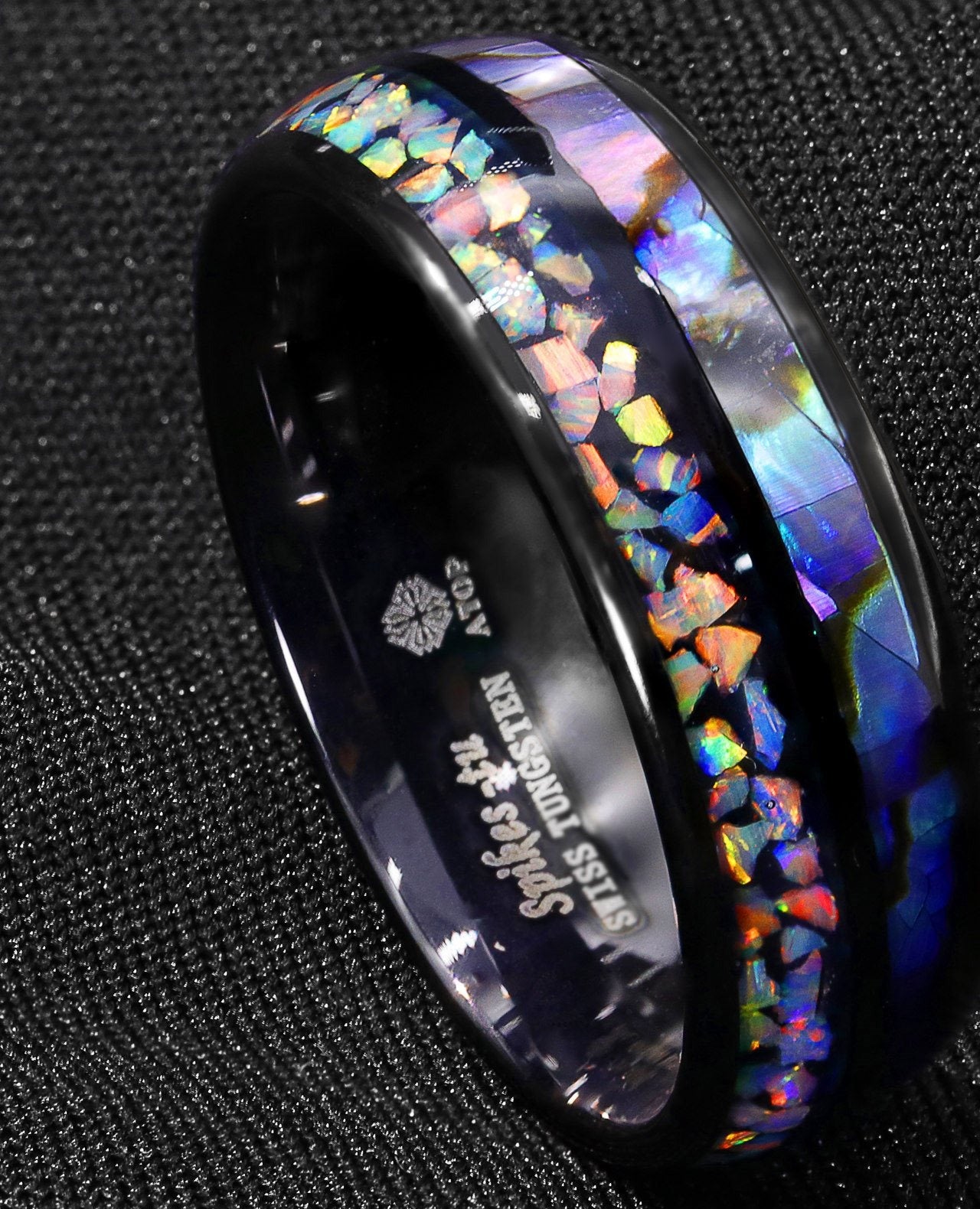 Men's 8mm Hawaiian Opal and Abalone Inlay Black Tungsten Ring Description: