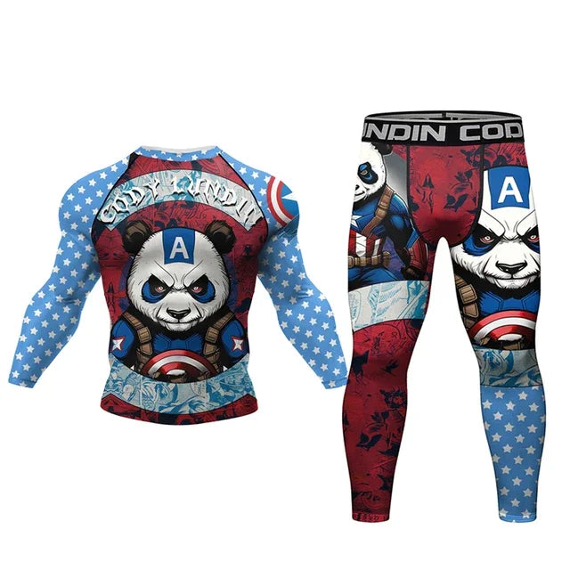 Featuring a fierce design and bold colors, the Panda Compression 'Captain Panda' Long Sleeve Rashguard 2 Piece Set not only performs well but also looks fantastic. It effectively communicates your warrior spirit, making you feel empowered as you take on your opponents.