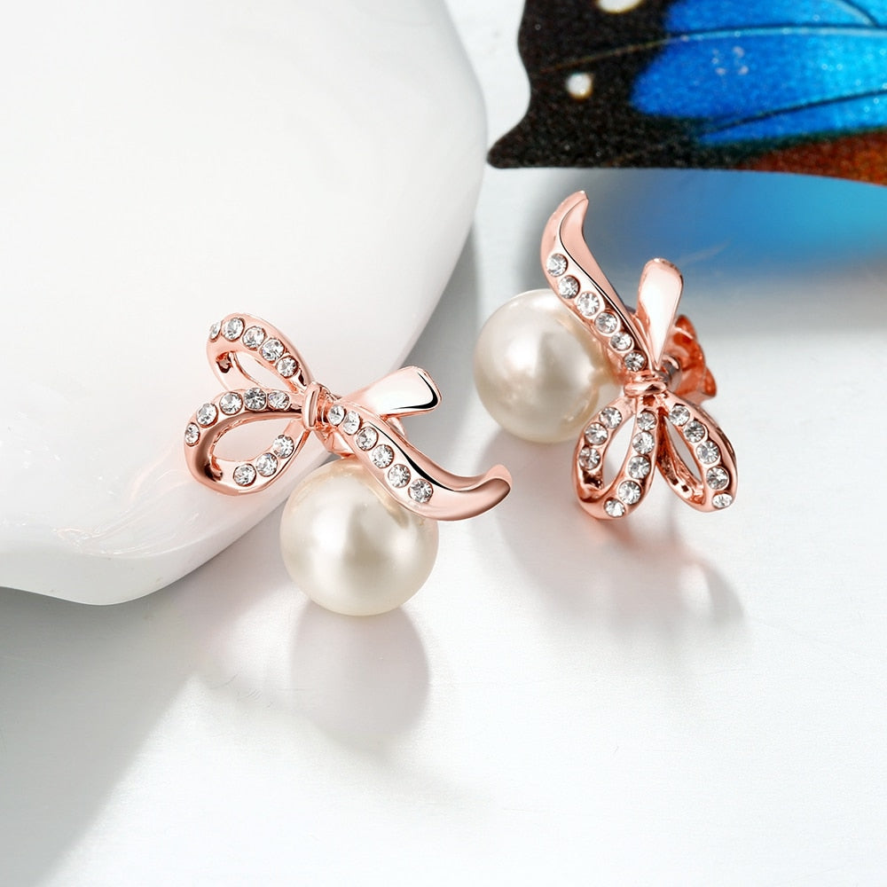 These Rose Gold Bow and Simulated Pearl Stud Earrings are perfect for a seriously glam look. Whether the lunch with the girls or dinner with your guy, perfect for all occasions.