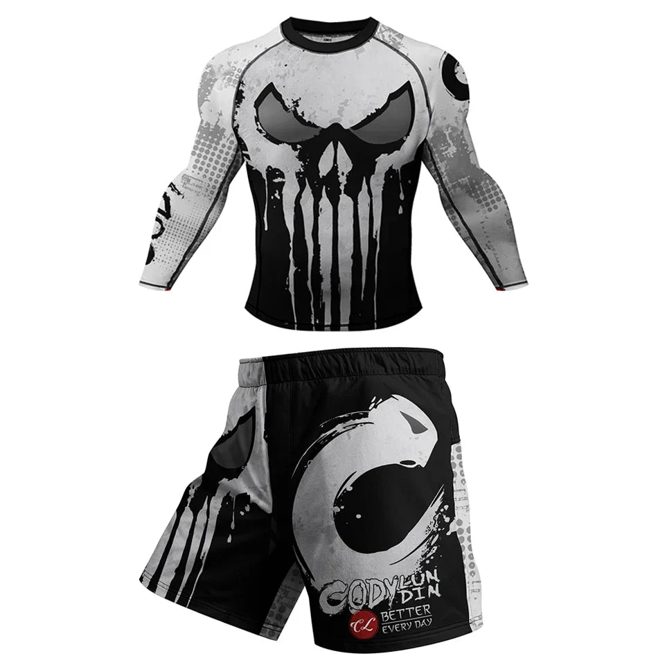 Unleash your inner warrior with the Skull Compression 'Hitman' Long Sleeve 2 Piece Set. Designed for the determined and the daring, this set is more than just workout gear; it's your ultimate training companion. Crafted from premium moisture-wicking fabric, it keeps you cool and comfortable as you push your limits on the mats. The sleek compression fit not only enhances your performance but also provides muscle support, allowing you to focus on perfecting your technique without distractions.