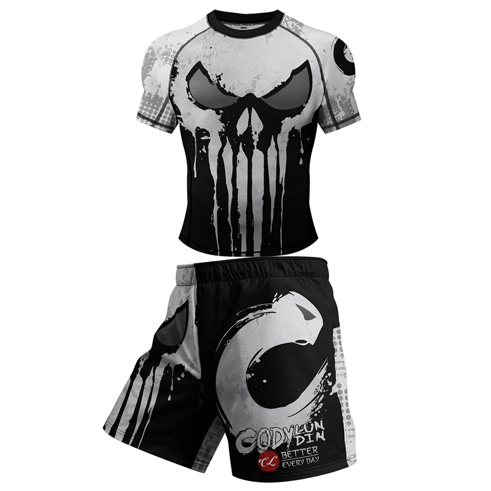 Unleash your inner warrior with the Skull Compression 'Hitman' Short Sleeve 2 Piece Set. Designed for those who take their training seriously, this set is more than just apparel—it's your battle gear for achieving greatness on the mats. Crafted from premium moisture-wicking fabric, it keeps you cool and comfortable, allowing you to focus on your skills without the distraction of sweat.