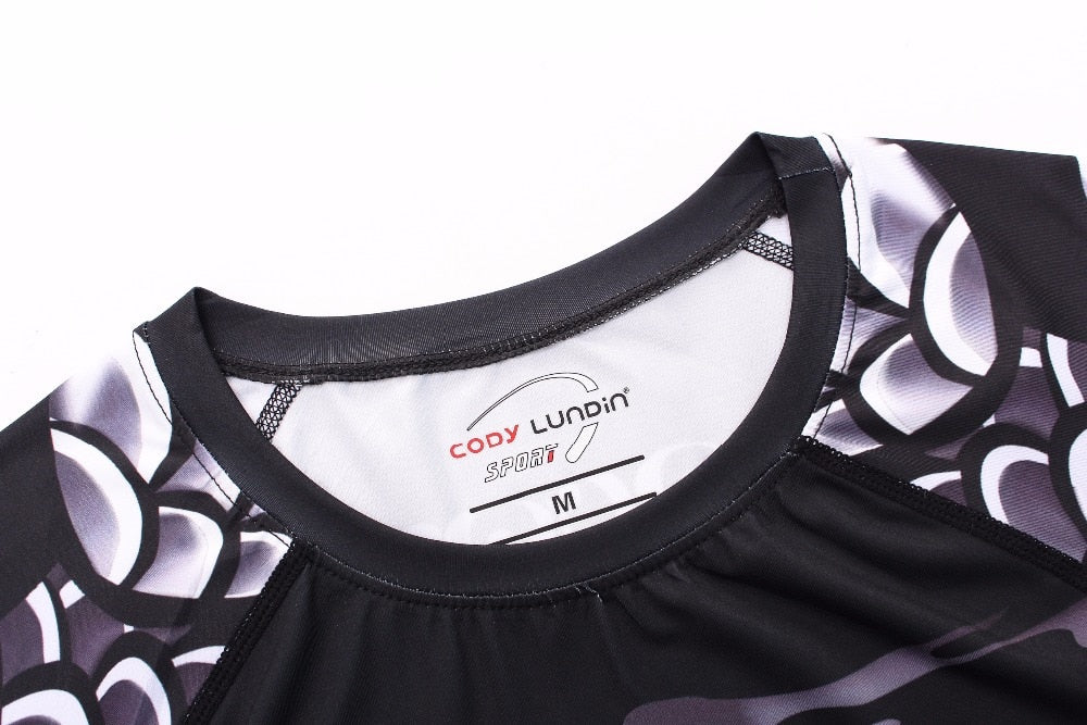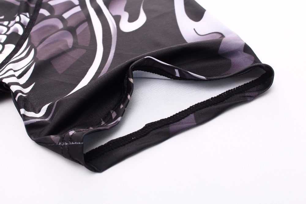 - Style: silver dragon-inspired design and short sleeve for a confident gym look.
